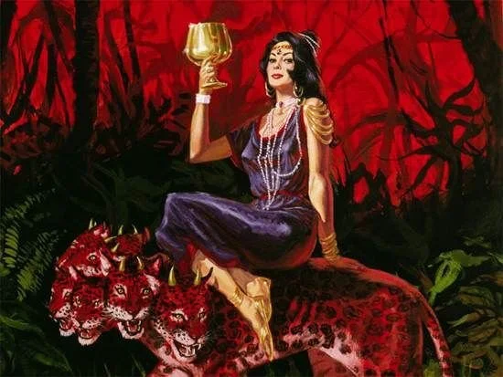 So he carried me away in the spirit into the wilderness: and I saw a woman sit upon a scarlet coloured beast, full of names of blasphemy, having seven heads and ten horns. And the woman was arrayed in purple and scarlet colour, and decked with gold and precious stones and pearls, having a golden cup in her hand full of abominations and filthiness of her fornication: